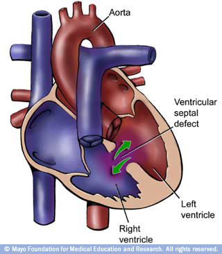 What they found is that Baby Nugget has two heart defects. One is called a VSD, which is basically an opening between the ventricles [lower chambers of her heart] that allows blood to pass through freely, both ways. This one is the most common congenital heart defect, and can sometimes repair itself. The other options are applying a patch between the ventricles through a catheter, or if it's too severe they would repair it through open-heart surgery. [These are some pictures from the Mayo Clinic's slideshow.]
